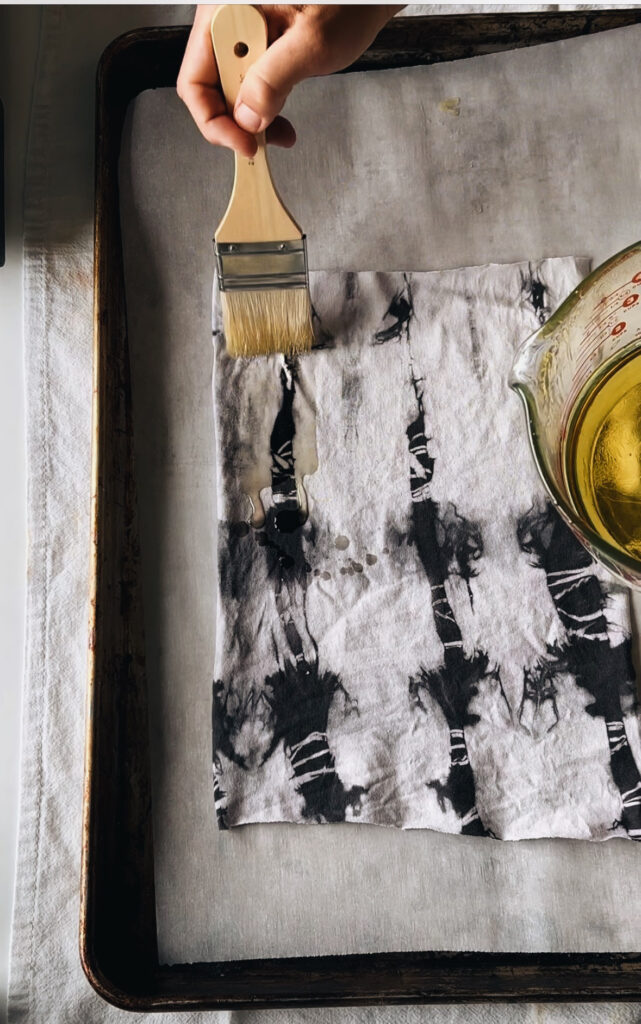 - Holding the fabric from one corner (the mixture will be quite tacky), use a paintbrush to brush the wax mixture over the entire fabric on one side. Less is more here as we can always add more mixture once heated in the oven.