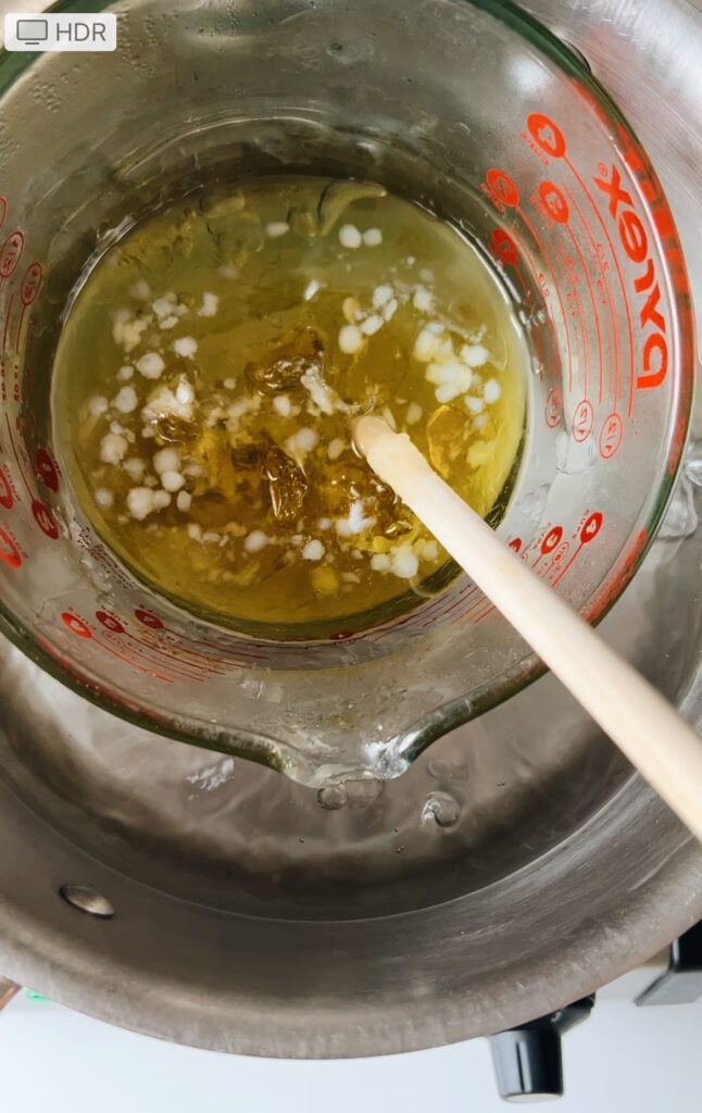 - Add water to the saucepan until the mixture in the double boiler is below the waterline. This is different from making a double boiler for chocolate where you don’t want the chocolate to burn. The ingredients in this recipe are much firmer and will need lots of heat to liquefy.