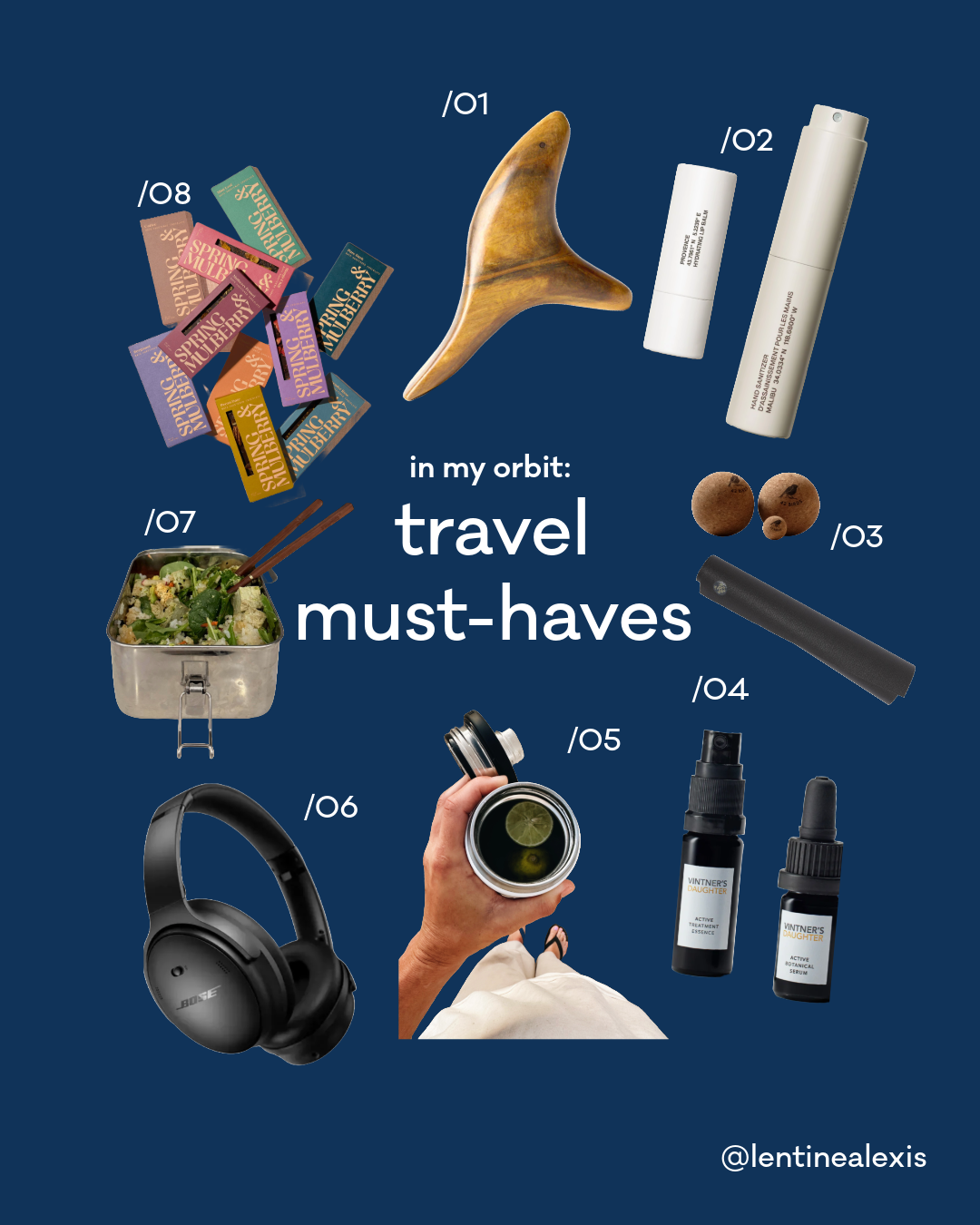 This months “ORBIT” is all about the travel necessities that make me feel whole when I’m on the road; the things that come and go with me wherever I roam.