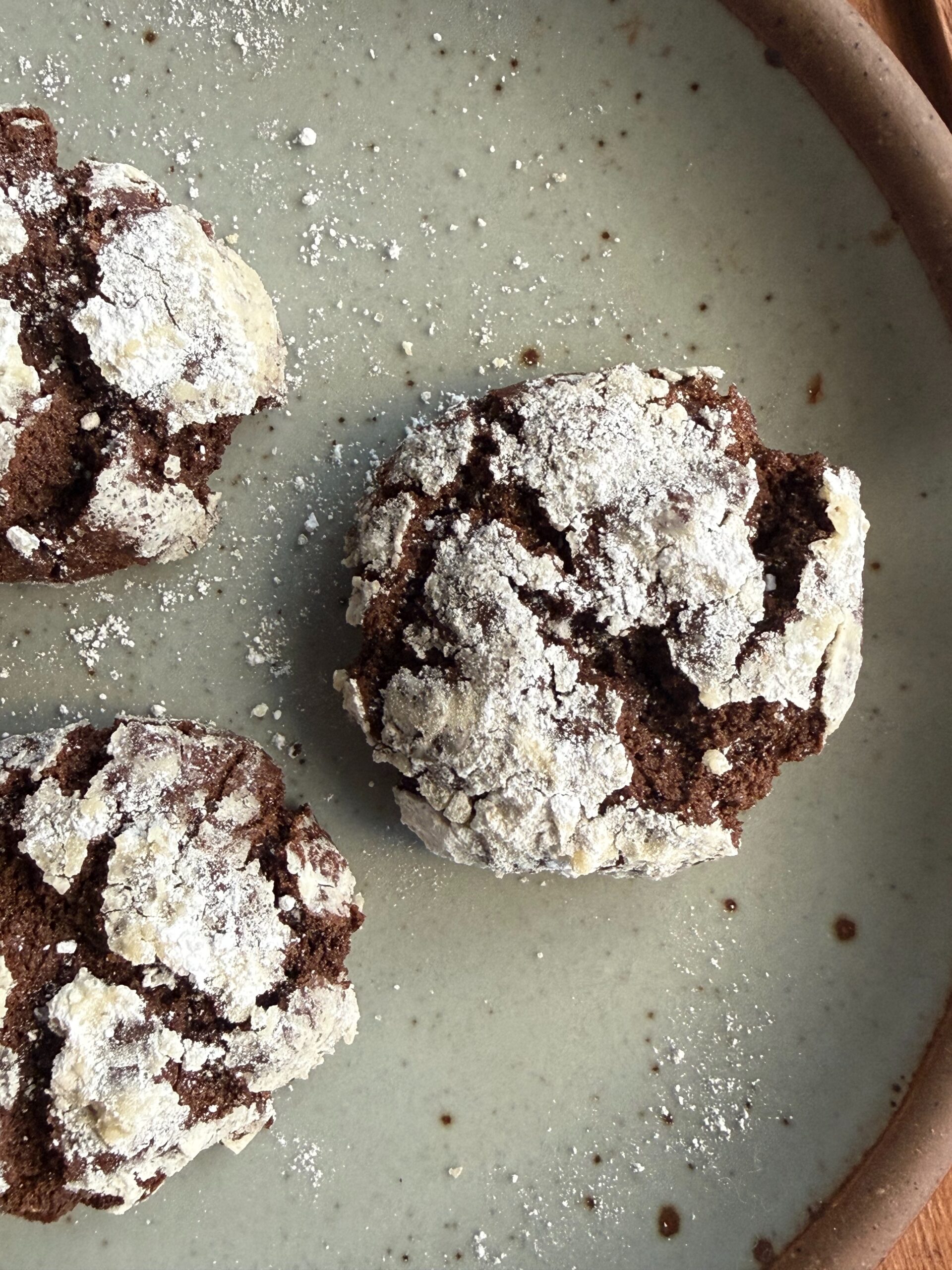 Third, mix it up and have fun. I try not to bake more than one cookie using any single ingredient or of a certain type. So there’s one sugar cookie, one sablé cookie, something chocolate, something fruity, something nutty…and I try to have a variety of shapes and colors. This dense, chewy, rich and chocolatey crinkle cookie certainly fits a bill in the cookie box!