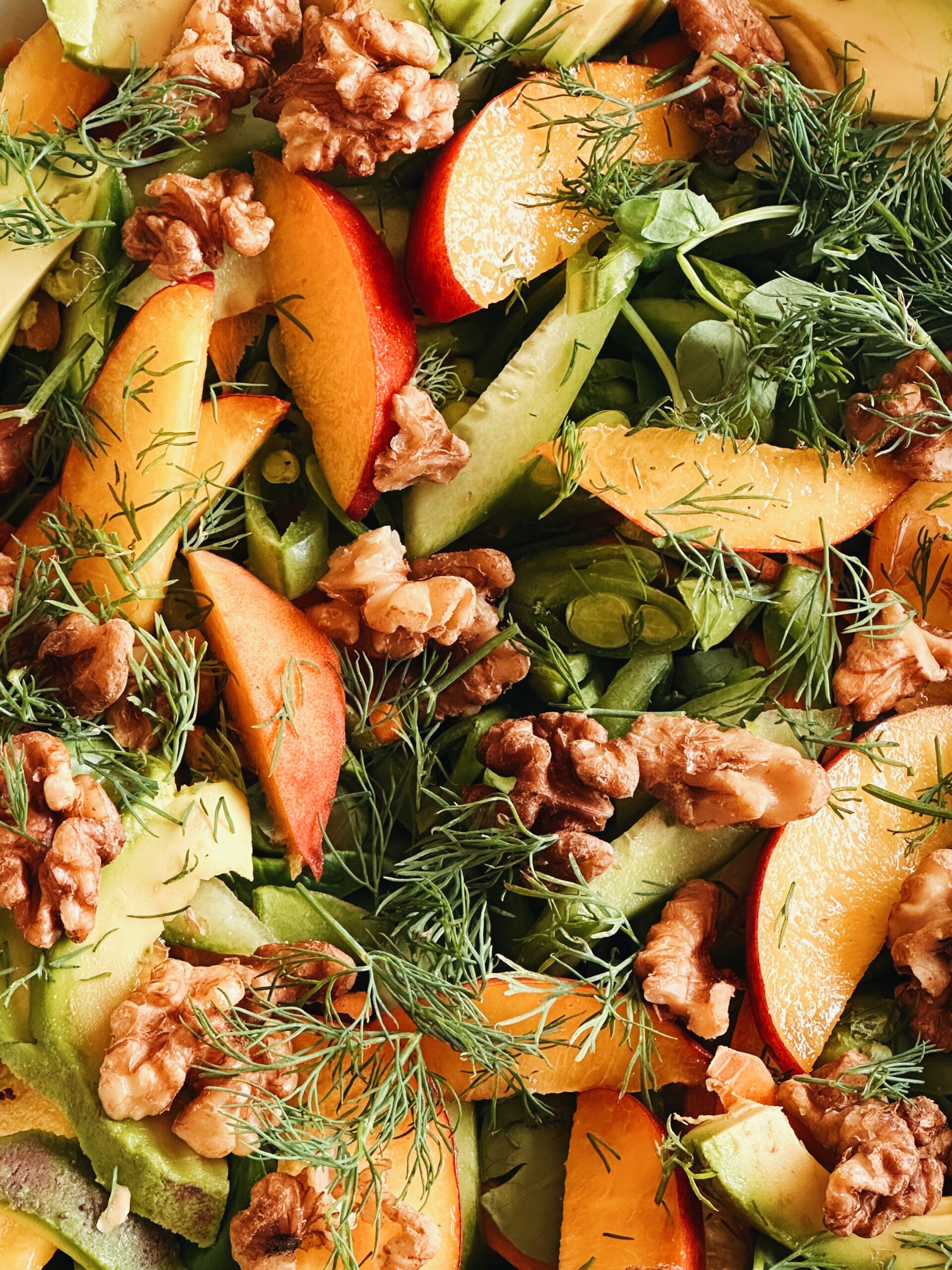 Juicy peaches, tender peas, crisp cucumbers, and dill for digestion—light, fresh, and perfect for midday athlete fueling